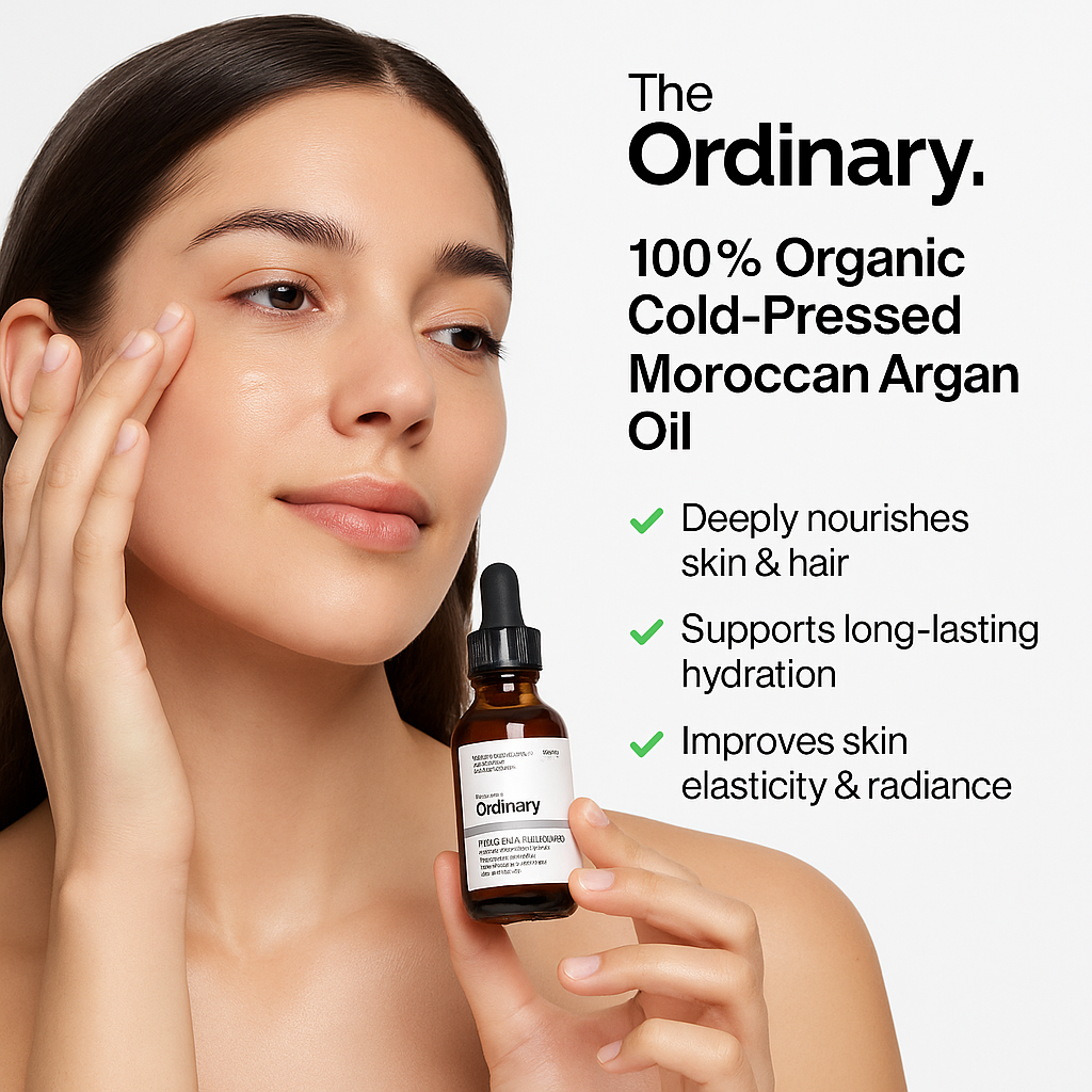 Pure, cold-pressed Moroccan Argan Oil delivers essential fatty acids and vitamin E that lock in moisture and revive dry, dull skin — naturally.
